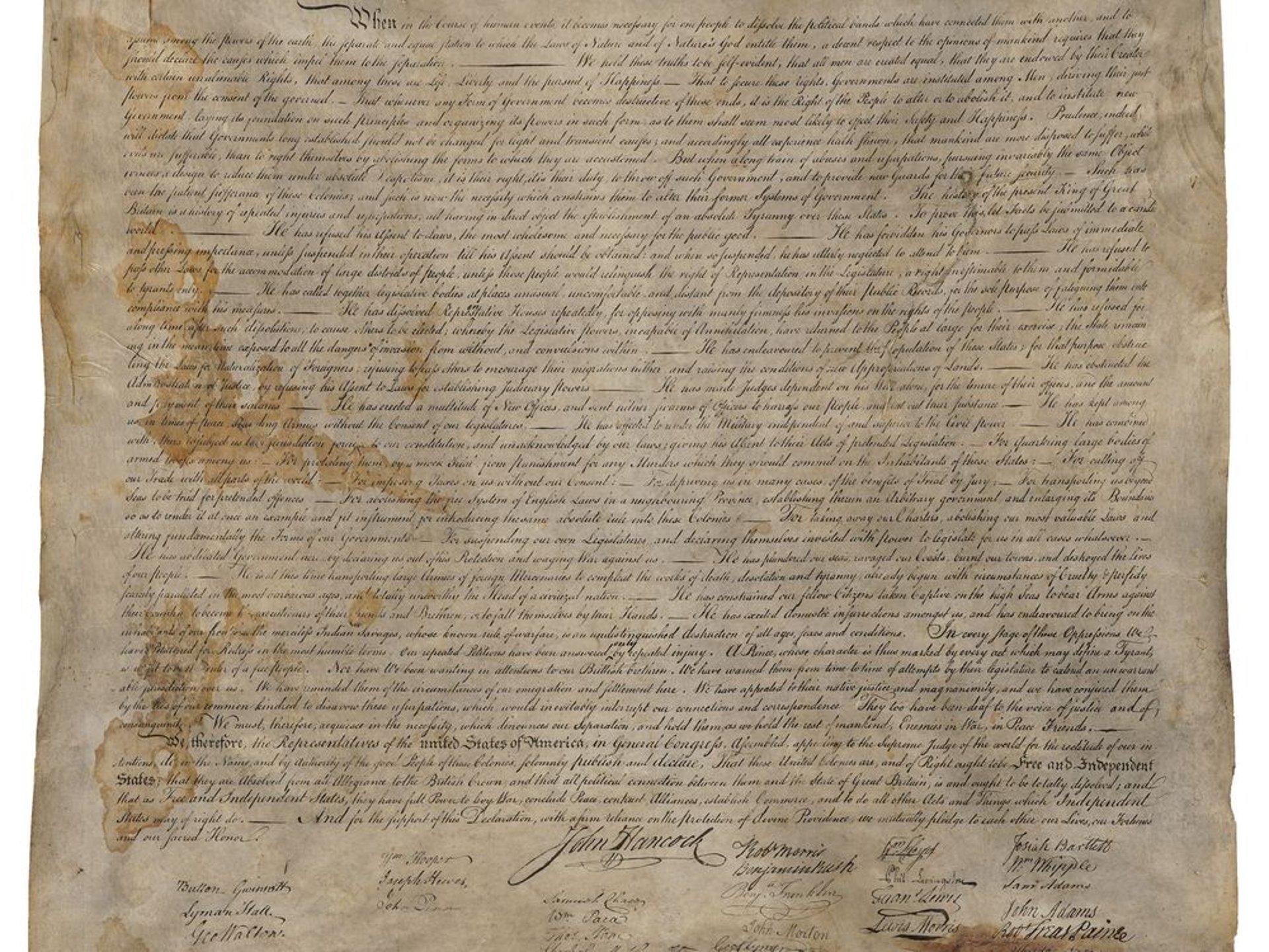 " We hold these truths to be self-evident, that all men are created equal, that they are endowed by their Creator with certain unalienable Rights, that among these are Life, Lberty and the pursuit of Happiness.—That to secure these rights, Governments are instituted among Men, deriving their just powers from the consent of the governed, —That whenever any Form of Government becomes destructive of these ends, it is the Right of the People to alter or to abolish it, and to institute new Government, laying its foundation on such principles and organizing its powers in such form, as to them shall seem most likely to effect their Safety and Happiness. Prudence, indeed, will dictate that Governments long established should not be changed for light and transient causes; and accordingly all experience hath shewn, that mankind are more disposed to suffer, while evils are sufferable, that to right themselves by abolishing the forms to which they are accustomed. But when a long train of abuses and usurpations, pursuing invariably the same Object evinces a design to reduce them under absolute Despotism, it is their right, it is their duty, to throw off such Government, and to provide new Guards for their future security.—Such has been the patient sufferance of these Colonies; and such is now the necessity which constrains them to alter their former Systems of Government. The history of the present King of Great Britain is a history of repeated injuries and usurpations, all having in direct object the establishment of an absolute Tyranny over these States. To prove this, let Facts be submitted to a candid world."